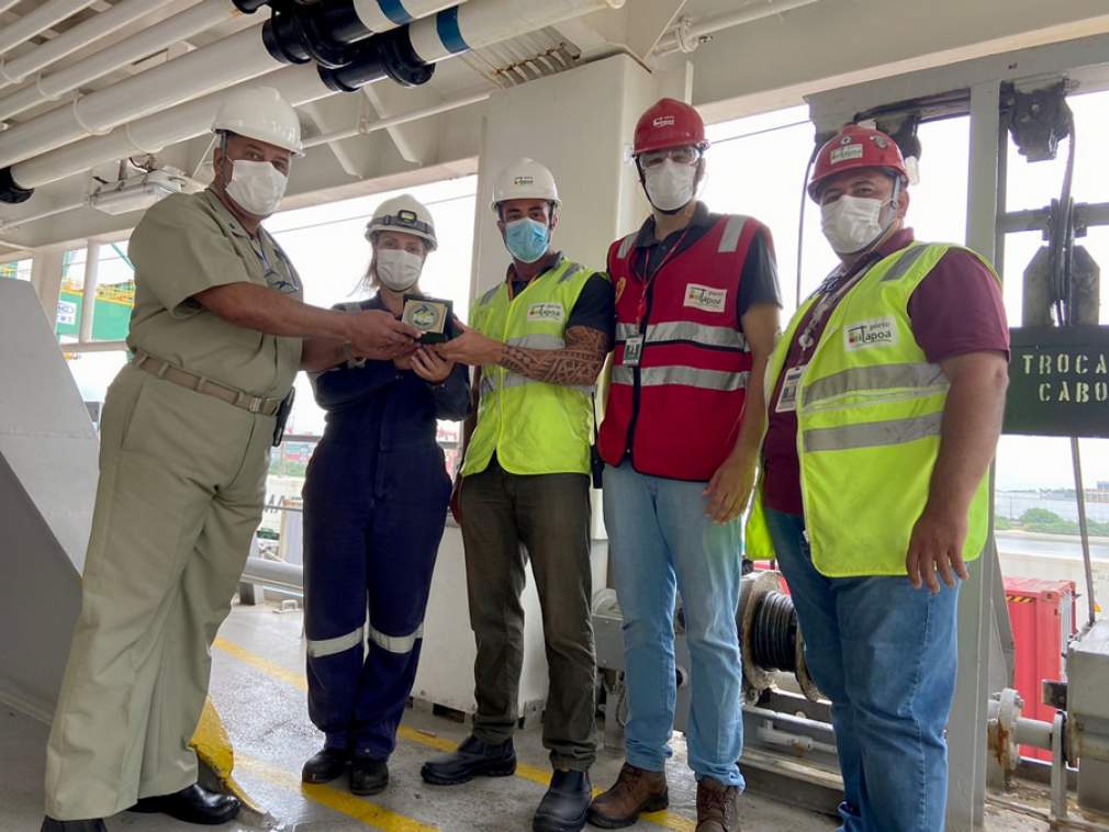 Também estiveram presentes na entrega os idealizadores da campanha, os técnicos de Segurança do Trabalho, Luiz Mascarenhas e Cléber Mello, o supervisor de Segurança do Trabalho e Saúde Ocupacional, Renan Schneider, do Porto Itapoá; além da imediata do comandante do navio Bartolomeu Dias, Márcia Haegely Condor.