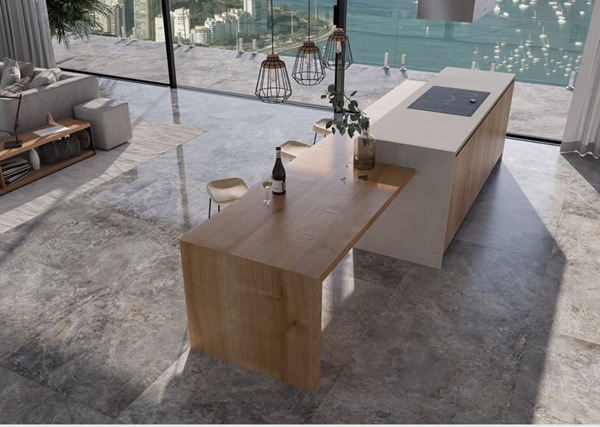 Linha Fior di Bosco, da Roca Cerámica, com paginação alinhada no piso