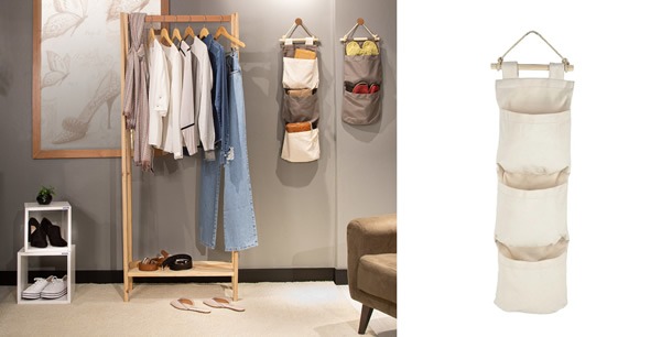 Organizadores verticais com 2 ou 3 bolsos, nas cores cinza e natural para ganhar espaço