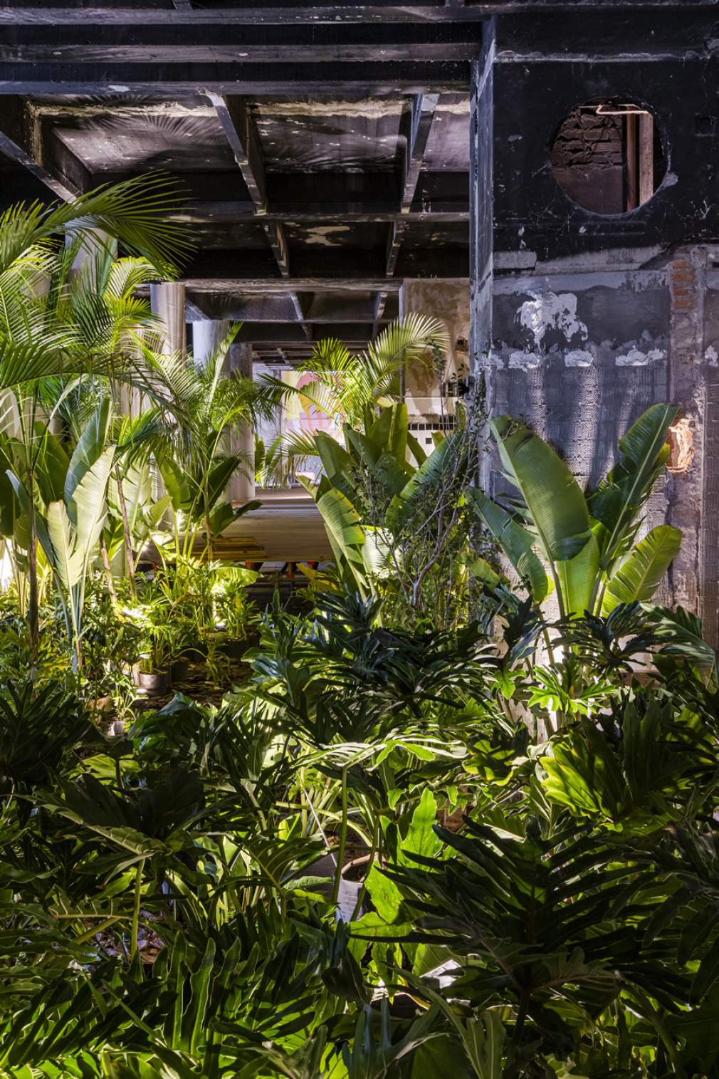 O caminho da alameda do Jardim também revela Clusias, Ondulatas, mais Ravenalas e muitos Guaimbés, com iluminação assinada pela empresa Lucenera, do light designer Filippo Giorgi, que produz efeitos de sombras e desenhos nas paredes e teto de toda a extensão do jardim, utilizando 82 luminárias com a parceria e expertise da empresa Box76projetos, responsável por toda parte elétrica. No fim do percurso, ao descer a rampa de madeira, vasos de cimento com acabamento em granilite da Meu Colorido Home Garden, exclusivamente desenvolvidos para o espaço, se despedem dos visitantes.