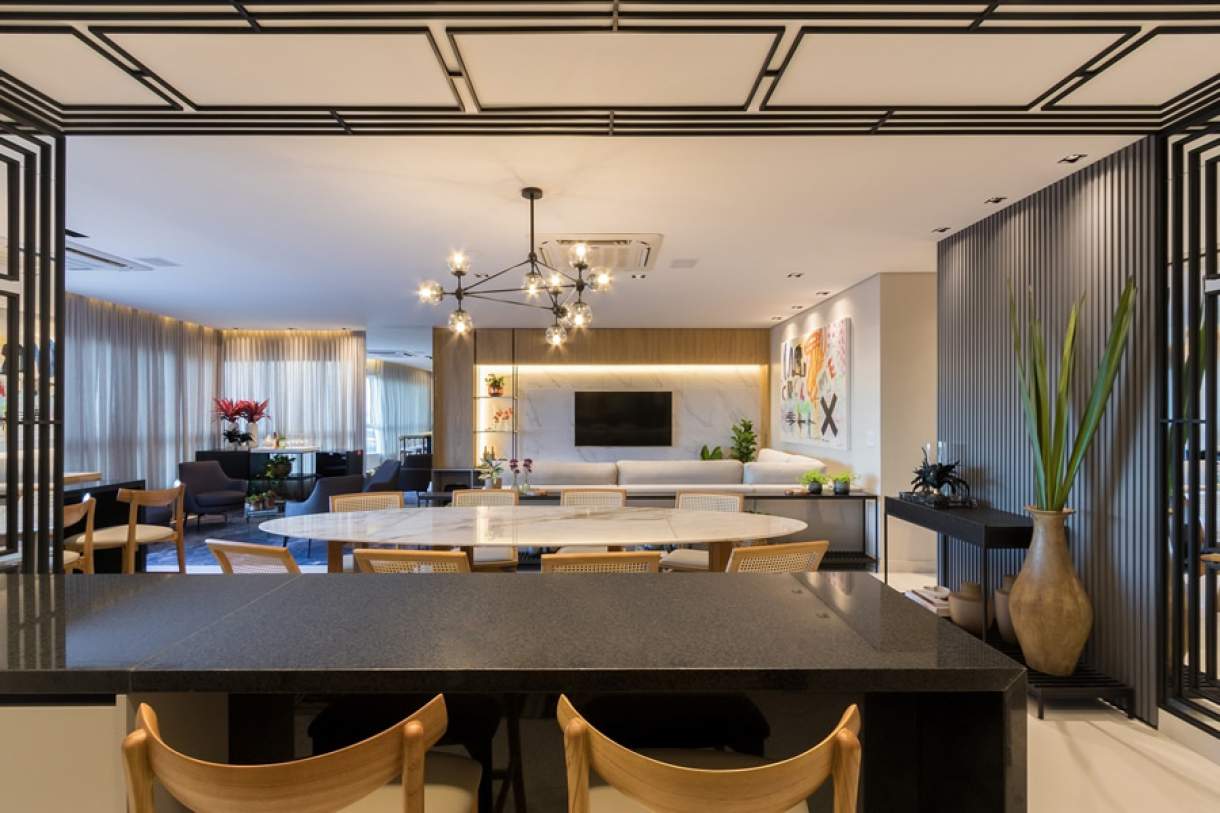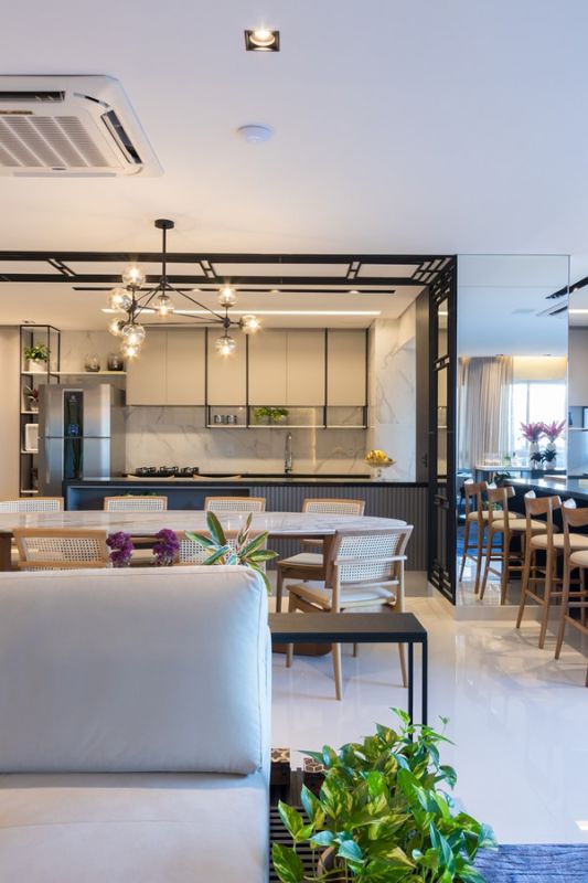 Por exemplo, aqui, o desenho da serralheria entre a sala e a cozinha divide os ambientes visualmente, sem perder a integração, e serviu para esconder um pilar existente no “meio” dos espaços | Foto: Luana Castro