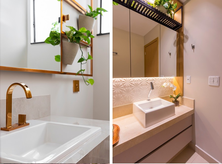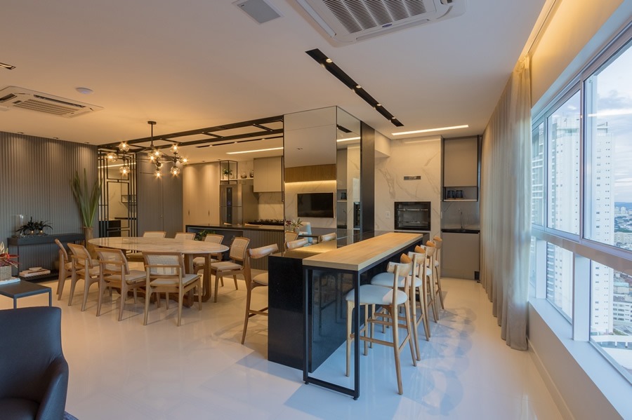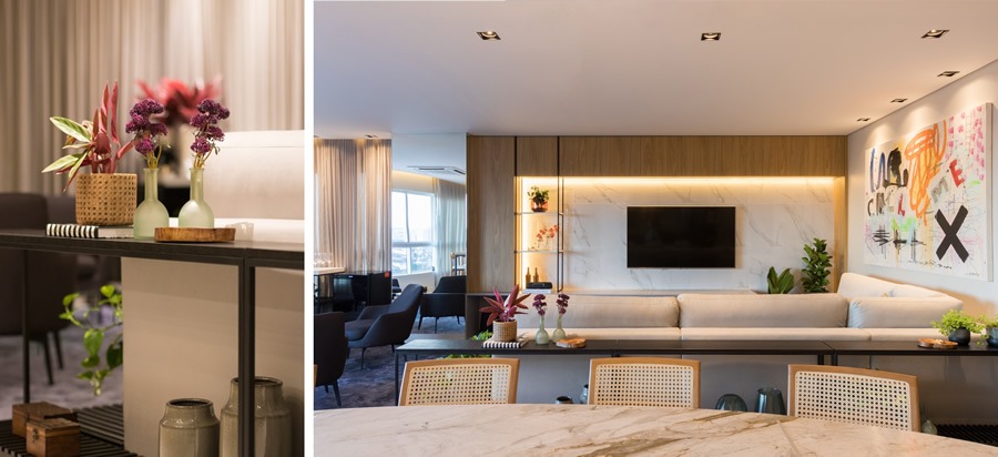 Inclusive, a junção com a marcenaria ajuda a melhorar o custo, já que é possível criar estantes limpas e mais leves. Sem as caixarias dos armários e com apenas as prateleiras, o valor das peças de marcenaria tendem a diminuir. Além disso, a mistura dos dois elementos é perfeita para garantir uma proposta única, cheia de personalidade.