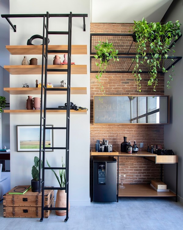 Desenhada para que o cliente pudesse acessar as prateleiras do pé direito duplo, a escada ajudou a compor o ambiente, garantindo um charme extra para o espaço | Foto: Ludmilla Oliveira
