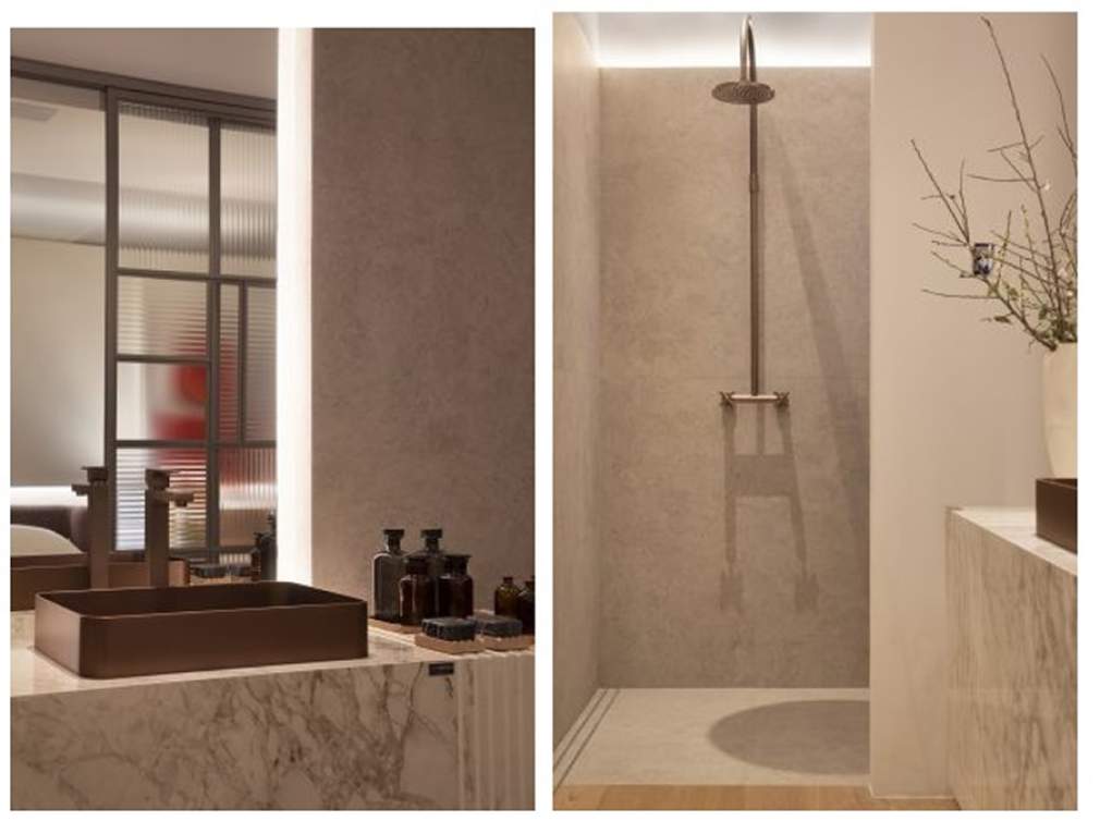 No Senses Hall Deca, a contemporaneidade ganha o minimalismo oriental em uma paleta sóbria, presente em louças, metais e acessórios que se misturam a madeira clara e a leve rusticidade de revestimentos. No SPA, a área de massagem traz a bancada que acomoda a Cuba Gota, lançamento Deca no acabamento Terracota, exclusivo para o ambiente. Com design externo clean, traz em seu interior o efeito visual da água ao ser tocada em sua superfície estática por uma gota. O monocomando LK na textura Trama Senses, em Cinza Antracite, também criada para mostra e com desenho reproduzido nos painéis de madeira, ressalta a funcionalidade e estética apurada. Nele, o revestimento Vulcan Portinari no formato 60x120, desenvolvido para o projeto, está aplicado no piso de todos os espaços e em bancos.