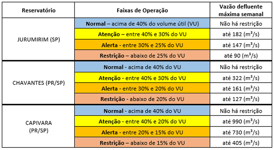 Para todas as faixas de operação, deverão ser atendidos os requisitos ambientais e a vazão mínima remanescente determinada pelo órgão licenciador. Outro ponto previsto pela Resolução ANA nº 132/2022 é a suspensão das condições de operação nesses três reservatórios da bacia do Paranapanema em situações de controle de cheias e em casos relacionados a segurança de barragem.