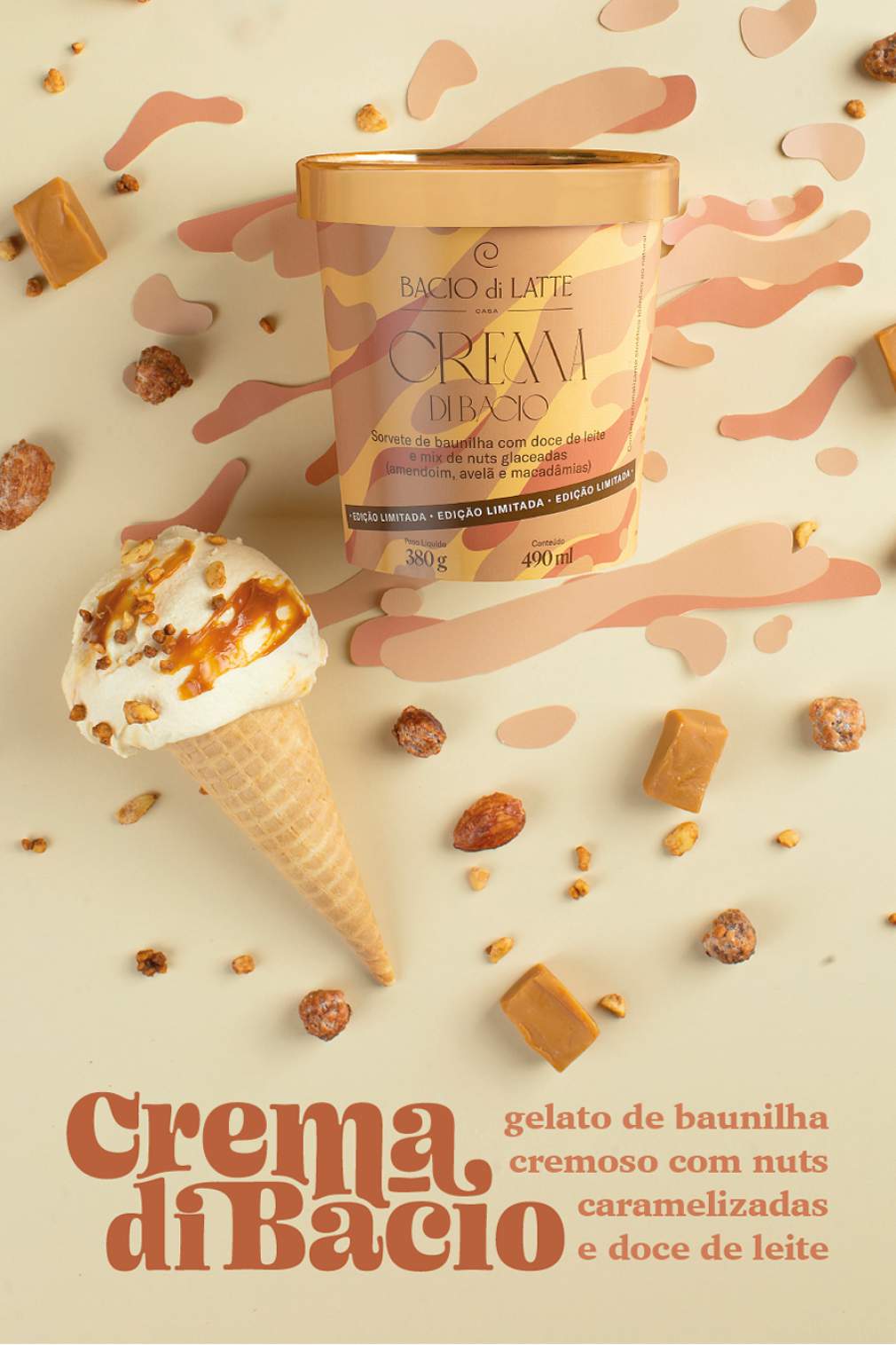 O Crema di Bacio é uma combinação irresistível de gelato cremoso de baunilha, doce de leite e nuts caramelizados, uma receita exclusiva da marca, que se une às 22 opções do cardápio fixo da gelateria e aos doze sabores icônicos dos potes Bacio Casa.