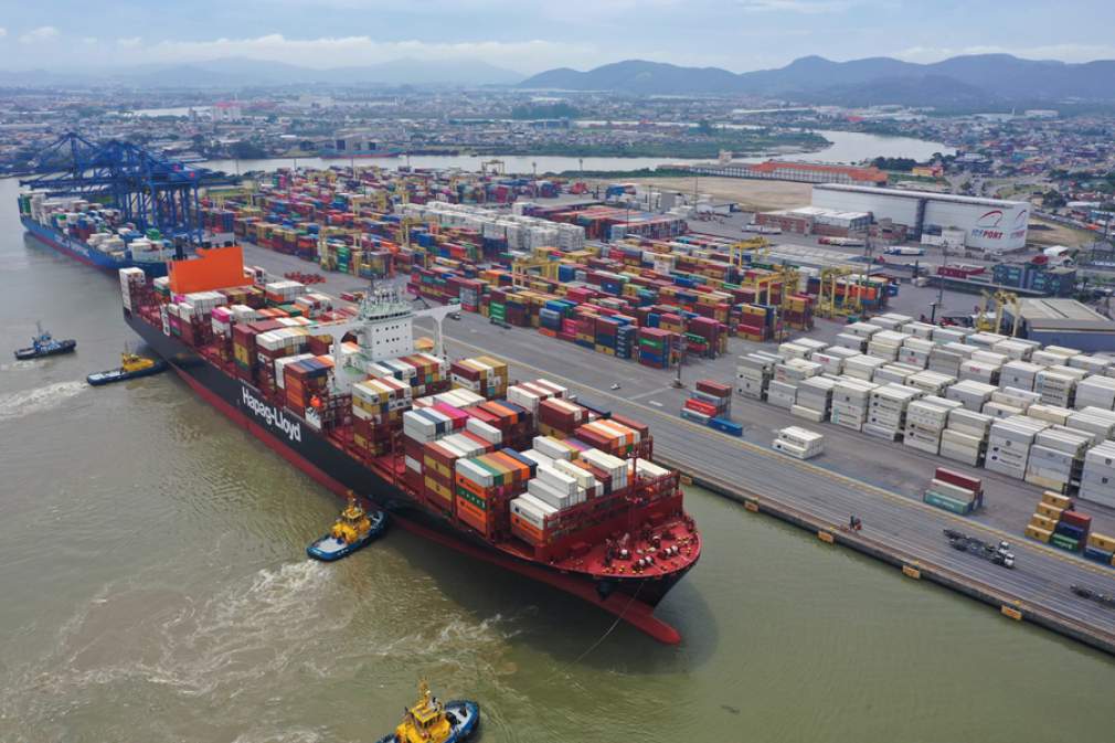 Com 335 metros de comprimento e 51,5 metros de largura, o navio Rio de Janeiro Express, do armador Hapag Lloyd, atracou na Portonave no sábado (29). Em termos de capacidade, é o maior navio porta-contêineres a operar na costa leste da América do Sul.