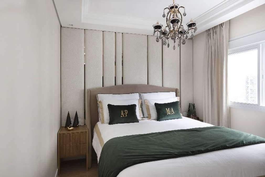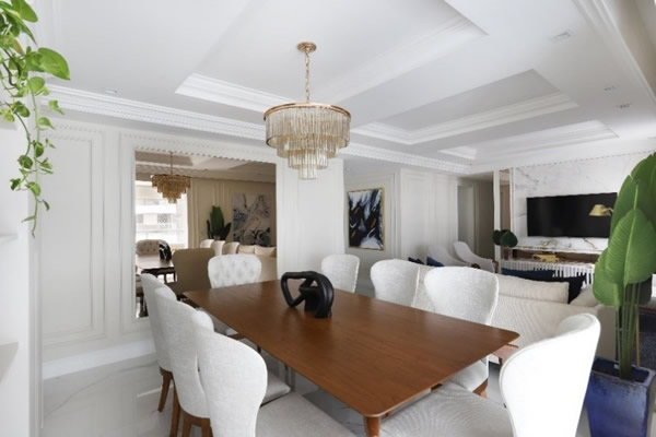 Nesse projeto com traços de um décor mais clássico, rodeado por obras de arte e boiserie, um dos desejos de seus moradores era a instalação de lustres em quase todos os cômodos. Porém, os apartamentos não costumam ter um pé direito muito alto e, com a planta em questão, não foi diferente. Com a presença das boiseries, a arquiteta lidou com mais um ‘agravante’ no desafio de não transmitir a sensação de uma altura baixa do pé-direito. “Realizamos um estudo para posicionar não só esse, como os demais lustres que constam em todo imóvel, já que não poderíamos perder a estética da boiserie. A solução foi trabalhar apenas com um rebaixo no entorno do teto, deixando o centro disponível para a peça”, detalha.