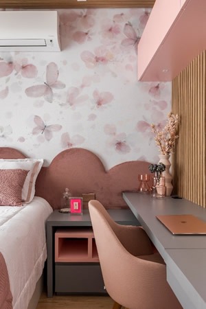 No dormitório, a mesa lateral se encaixa perfeitamente com a bancada de sua estudos. Em mais uma solução de marcenaria planejada e inteligente, a adequação estratégica possibilita um espaço perfeito para a abertura da bicama para o momento em que ela decidir receber as amigas em casa para dormir.