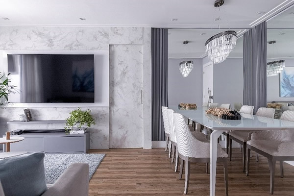 Nesse outro projeto, a solução é semelhante. Devido ao pé direito baixo do apartamento e ao desejo da família em instalar lustres pesados, estrutura de som e grandes espelhos de vidro, a arquiteta precisou adicionar uma nova camada para evitar danos ou quedas do gesso. “Quando os moradores optam por pendentes muito pesados ou outros elementos, como fechamento de vidro e portas de correr, o projeto deve contemplar uma estrutura de reforço, normalmente feita em madeira”, conta a especialista.