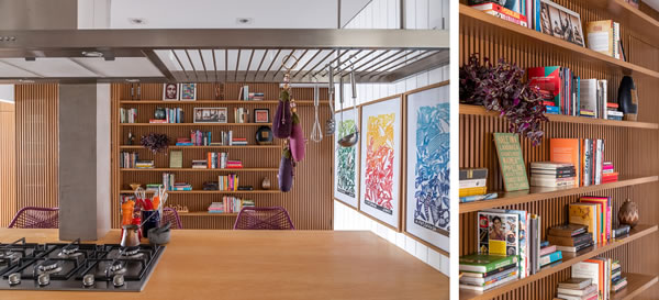 Uma ampla parede branca, de frente para a cozinha, virou um painel de marcenaria com prateleiras de pouca profundidade, que passou a abrigar os livros da família e alguns objetos e imagens que contam histórias deles | Projeto: Aiê Tombolato e Livia Salem | Fotos: Rafael Renzo