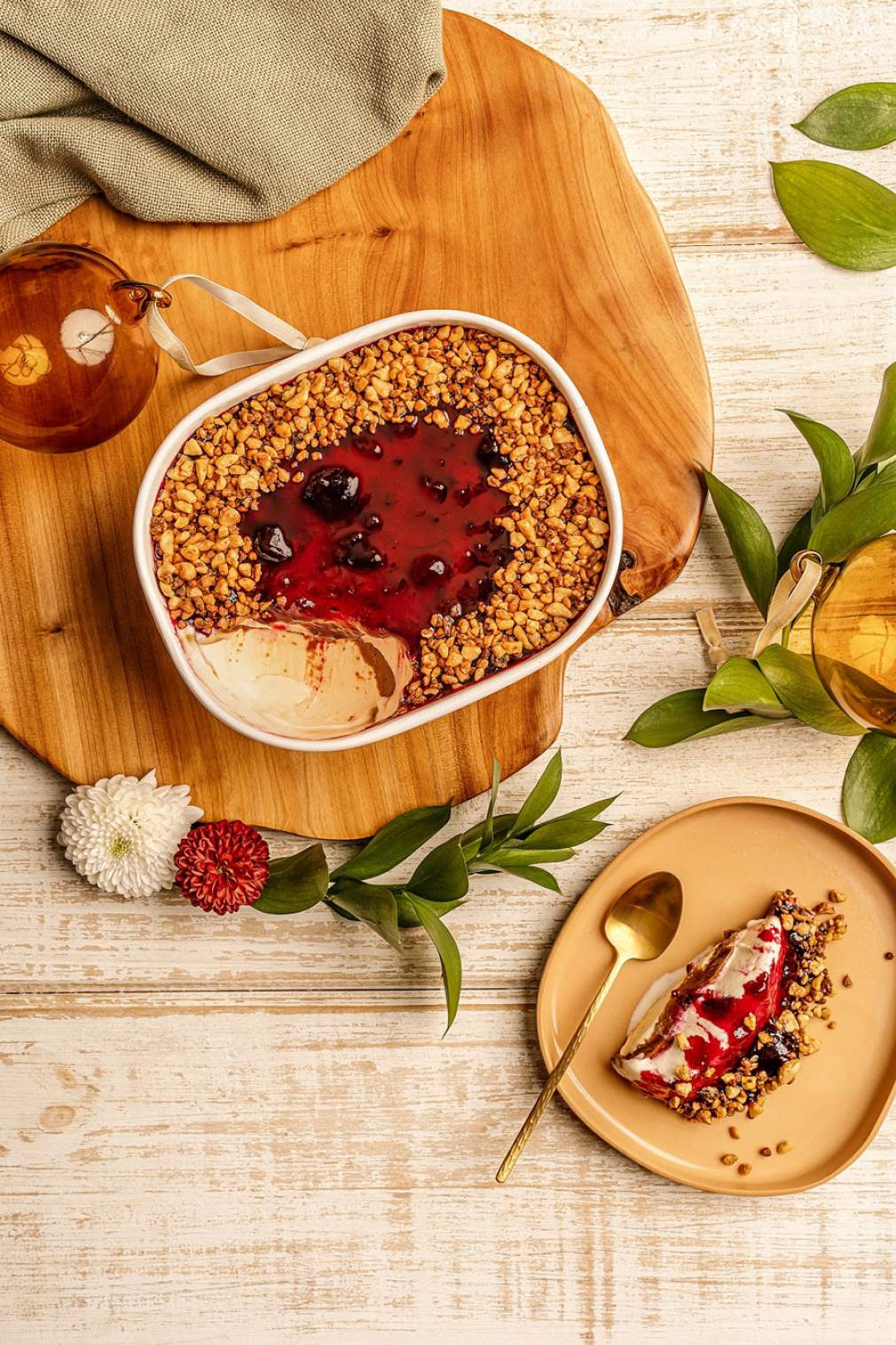 A Torta de Cereja Silvestre é uma sobremesa especial para celebrar o Natal. São duas camadas de gelato de baunilha com recheio de caramelo crocante, coberto por uma calda suculenta de amarena e nuts.