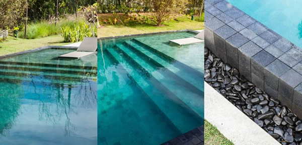 Quando chega a hora de escolher o visual e o acabamento, as possibilidades são inúmeras. A versão com bordas infinitas, na qual os limites da água se confundem com a paisagem do entorno, ampliando a sensação de fluidez, é uma das preferidas de Carina e Ieda. Nos modelos com borda convencional, as opções de revestimento incluem pastilhas, deck de madeira e pedras, desde que sejam antiderrapantes. Para a parte interna, a alternativa mais comum é adotar um acabamento que reforce a “cor de água”, como azulejos, pastilhas e rochas em tons de azul ou verde.