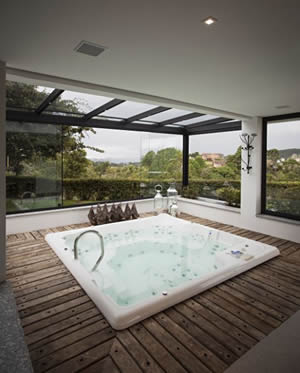 As possibilidades oferecidas pelos diversos modelos de banheira extrapolam o espaço do banheiro. Carina e Ieda enfatizam que fica ótimo instalar um ofurô ou uma hidromassagem na área externa, a exemplo do que aconteceu no projeto da foto abaixo. Trata-se de um chalé em Campos de Jordão que ganhou um spa no terraço, emoldurado num tablado de cruzetas e voltado para uma paisagem deslumbrante.