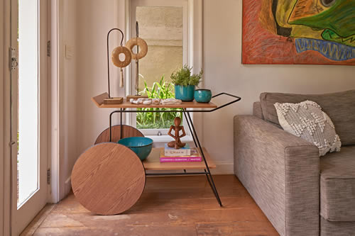 Na sala de estar, o carrinho de chá pode ser posicionado como destaque ou nas laterais. Quanto à sua função, tanto pode receber objetos decorativos ou ser o cantinho do bar |Foto: Richard Cheles