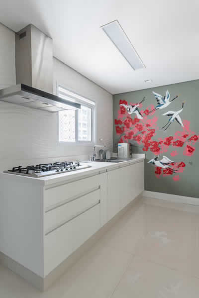 Com apenas 7m² e uma bancada com 2,10m de largura, em outro projeto de cozinha realizado por Cristiane recebeu toques especiais. Com pouco espaço para cortar os alimentos, ela incluiu uma tábua de madeira dentro da cuba. “Com isso, essa área agregou mais um utilidade: ao retirar a peça, volta a estar apta para lavar”, esclarece.