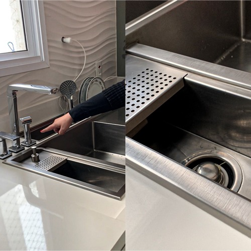 Entre os aparatos a serem instalados na pia da cozinha estão a calha úmida, um tipo de escorredor embutido para receber talheres, copos e pratos, dispenser interno para detergente, cuba ampla (duas fica ainda melhor!) acompanhada por uma cubeta de apoio; triturador de alimentos; tábua, escorredor e cestinhos para cuba de cozinha; torneira gourmet e touch e lixeira, entre outros.