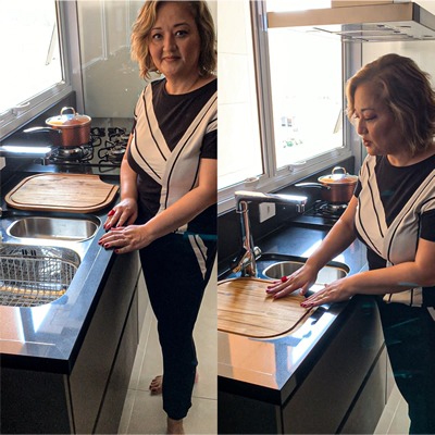 A arquiteta Cristiane Schiavoni mostra como a manipulação da tábua e do escorredor na cozinha compacta | Fotos: Divulgação