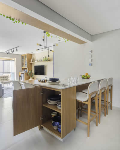 Com a cozinha integrada, é preciso ficar atento para não perder nenhuma oportunidade para ampliar os cantinhos de depósito, sempre, claro, tendo cuidado para não sobrecarregar o design – aqui, o móvel feito em marcenaria exerce função dupla de buffet, sem prejudicar a estética | Projeto BMA Studio | Foto: Guilherme Pucci