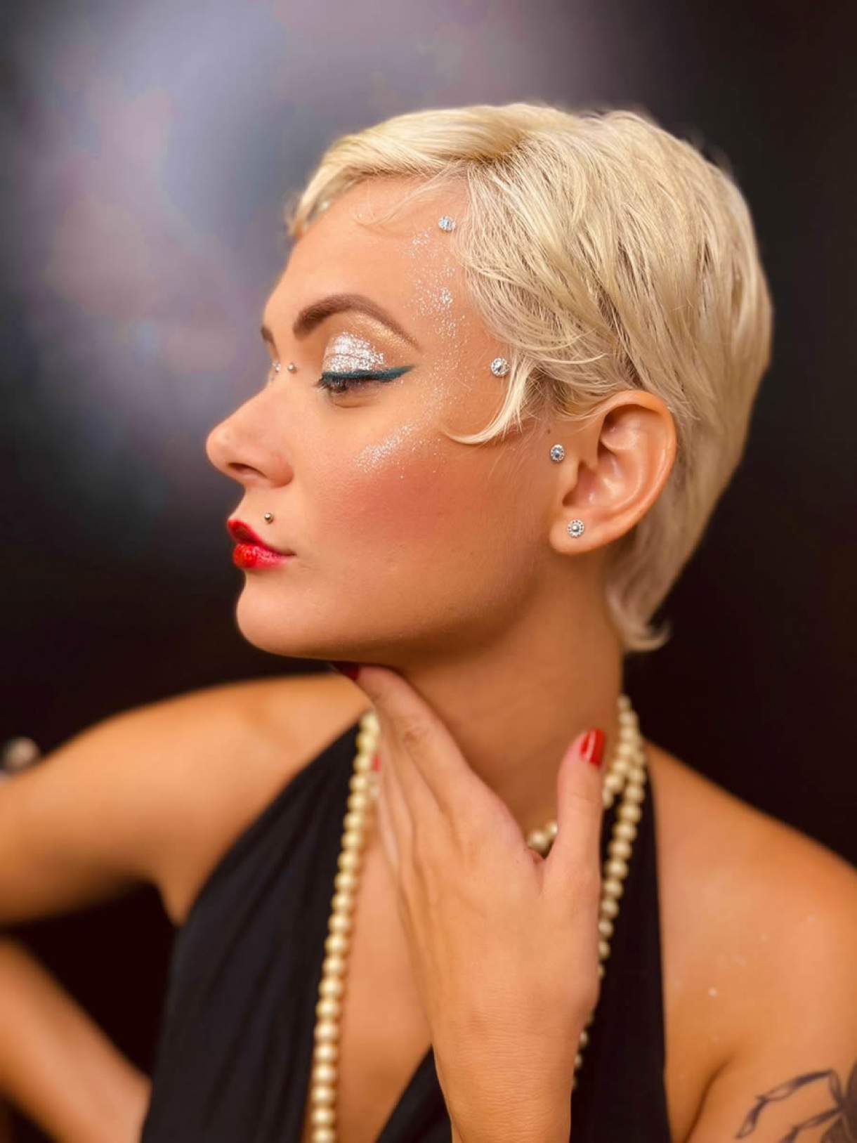 Representado os anos 20 essa produção é sempre um sucesso! Inspirada no Filme O Grande Gatsby mas com nossa pegada brasileira carnavalesca, a make ganha mais brilho e um delineador verde escuro para fugir do básico.