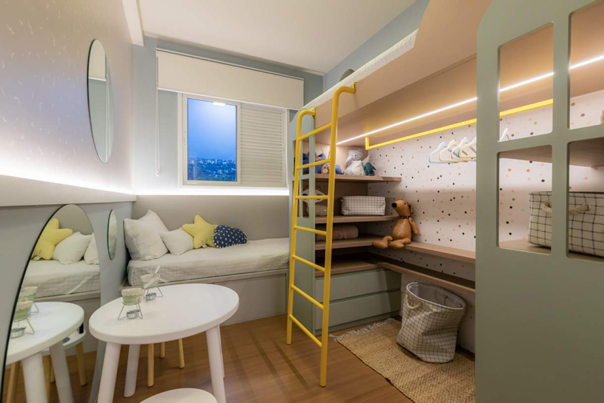 Conforme o crescimento da criança, é inevitável que o quarto vá precisando de adaptações para as novas demandas e necessidades, principalmente físicas. Aí, então, é necessário lançar mão do planejamento, sempre que possível. Com isso, mesmo que não seja viável manter 100% do mobiliário da primeira infância no decorrer dos anos, alguns móveis podem ser aproveitados por mais tempo. “O armário, por exemplo, pode ser utilizado por anos se estiver em uma tonalidade neutra que combine com diferentes estilos de decoração. Planejar mudanças a longo prazo ajuda na percepção do que deverá ou não ser trocado conforme o crescimento da criança. Assim, é possível economizar com mobiliários fixos”, comenta a arquiteta. O mesmo pode ser pensado para a cama, que, ao longo do tempo, pode ser trocada apenas a cabeceira ou regulada a altura. No caso do empreendimento Solar das Laranjeiras (Maringá-PR), a ideia do espaço para guardar brinquedos abaixo do beliche pode se transformar em escrivaninhas de estudo, por exemplo.