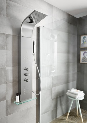 Para banheiros menores e que não comportam uma banheira, uma opção interessante são as colunas de hidromassagem. Na imagem, o modelo Evolution que possui dimensões de 22,6 cm x 129 cm* e cinco saídas de água | Foto: Divulgação Roca