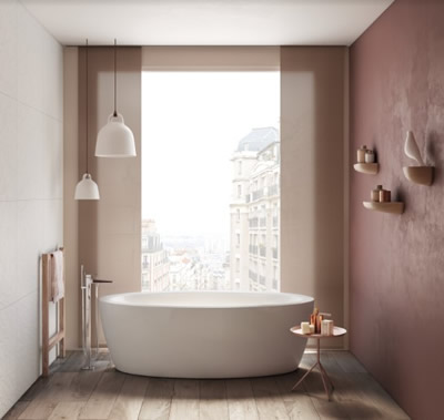 Em tons claros e luz natural, o amplo projeto do banheiro evidencia a banheira Ona. Um convite aprazível para desligar-se da agitação de um dia exaustivo para desfrutar de momentos de tranquilidade, equilíbrio e relaxamento com um banho de banheira | Foto: Divulgação Roca