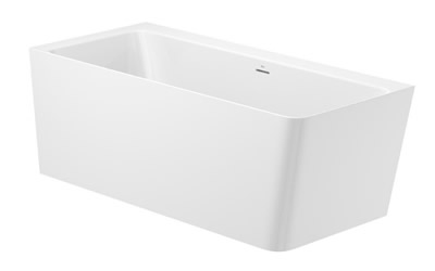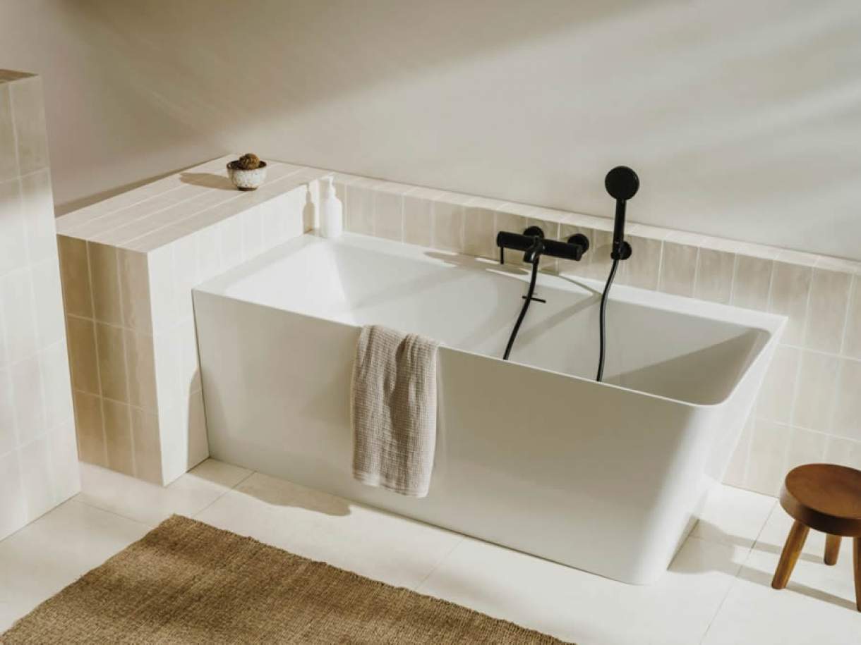 Banheira Freestanding Ona de canto esquerdo assimétrico (1600 x 700 mm) fabricado em Stonex®. Inclui válvulas e sifão integrado. | Foto: Divulgação Roca