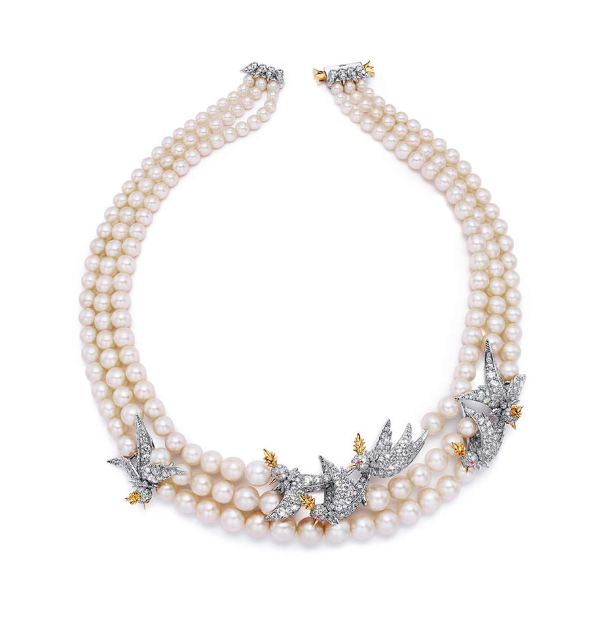 Uma obra-prima da coleção, é o colar de três voltas de pérolas naturais graduadas de água salgada com mais de 371 quilates no total. Notáveis pérolas barrocas, botões e quase redondas dão nova vida ao broche icônico, enquanto um pingente, brincos e anéis - cravejados com raras pérolas naturais de água salgada cinza escuro, cinza, creme claro, marrom rosado claro e pérolas brancas - são definidos por sutis acena para a estética de Jean Schlumberger.