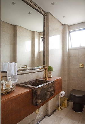 No lavabo realizado pela arquiteta Carina Dal Fabbro, as paredes chapas RU recebem o revestimento clássico especificado para o ambiente | Foto: Luis Gomes
