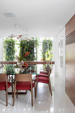 Um jardim vertical também pode fazer a diferença na sala de jantar, como mostra o projeto de Carina e Ieda Korman, onde o jardim acrescenta uma sensação de vida natural a mais para o ambiente | Projeto de Korman Arquitetos | Foto: Gui Morelli