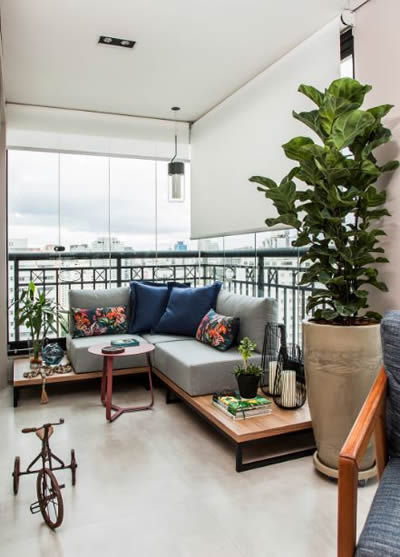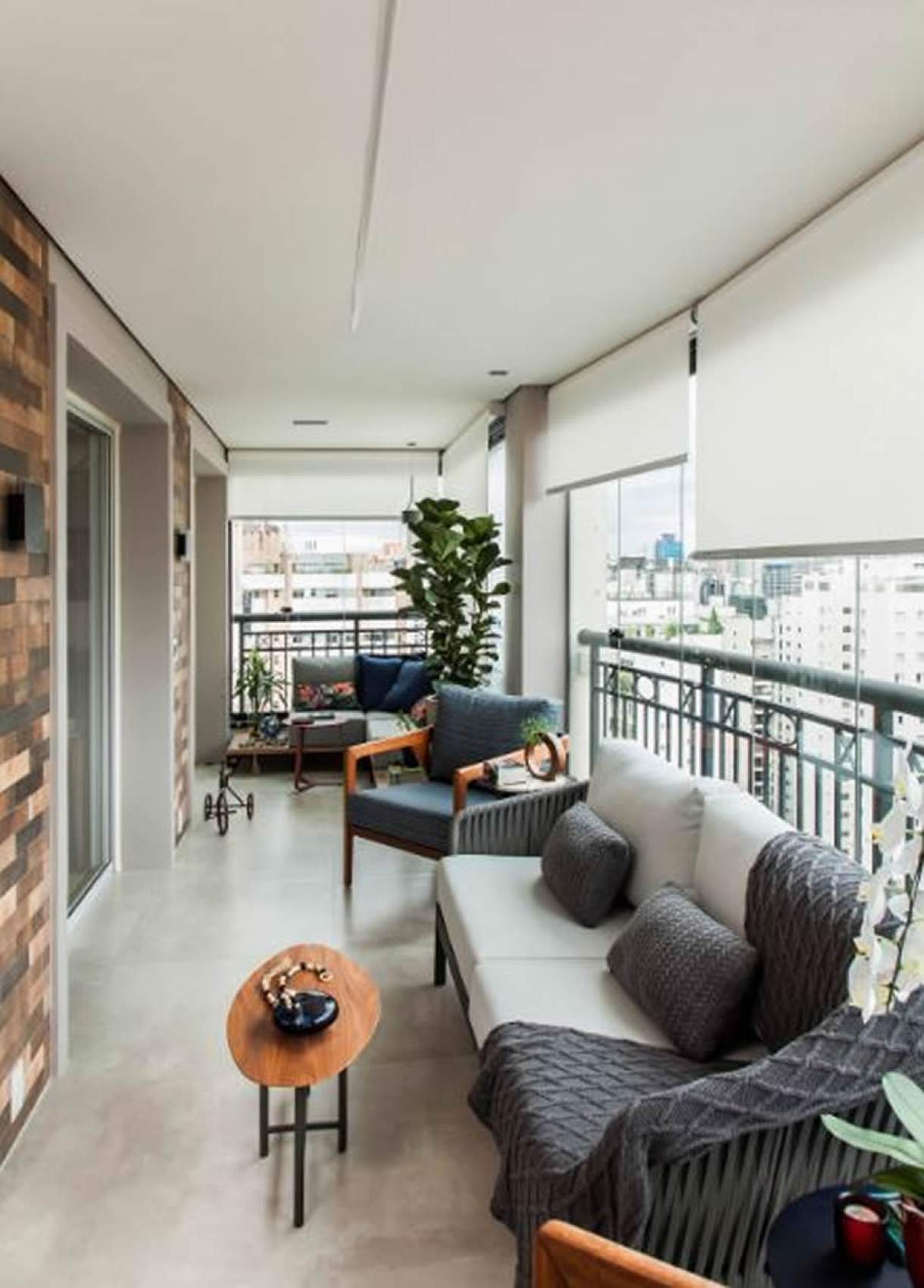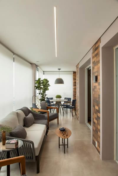Com as mudanças implementares no layout, a arquiteta logo cuidou de nivelar o piso e dividir o lazer entre o espaço, além de realizar melhorias no projeto luminotécnico e decorativo. Na reforma, um novo piso foi assentado em toda a metragem da varanda. “O maior cuidado para esse acesso foi justamente levantar o piso com argila expandida, um material mais leve que é super indicado para nivelamento e que não compromete a estrutura da varanda. Após esse processo, o piso foi finalizado e valorizado com porcelanato cinza queimado”, comenta a arquiteta.