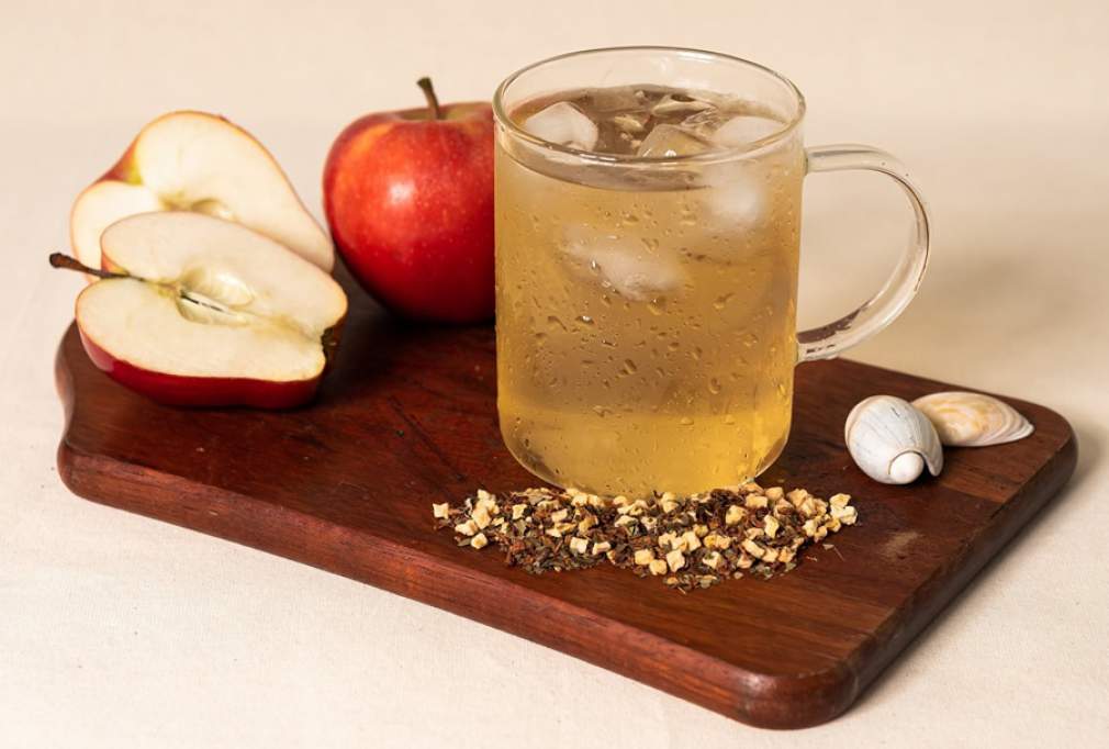 Use o blend Apple Temptation, da Tea Shop, que contém pedacinhos de maçã, folhas de amora e ácido cítrico.