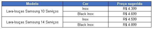 As lava-louças de 10 e 14 serviços, nas cores Inox e Black Inox, podem ser encontradas, hoje, na Loja Online da Samsung. A partir do meio de abril, as lava-louças poderão ser encontradas também nos varejistas nacionais. Confira a tabela de preços abaixo: