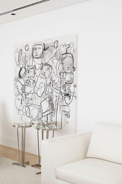 Para compor o ambiente, a obra de arte do artista plástico Loro Verz trouxe personalidade para a área da leitura, acompanhada de mesinhas laterais de vidro | Projeto de Korman Arquitetos | Foto: Gui Morelli