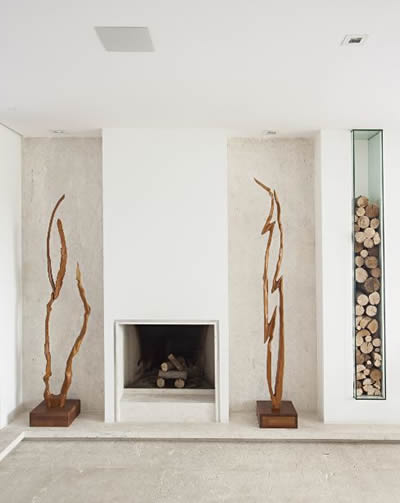 Na área da lareira, para deixar mais acolhedor, as arquitetas optaram por esculturas de madeira | Projeto de Korman Arquitetos | Foto: Gui Morelli