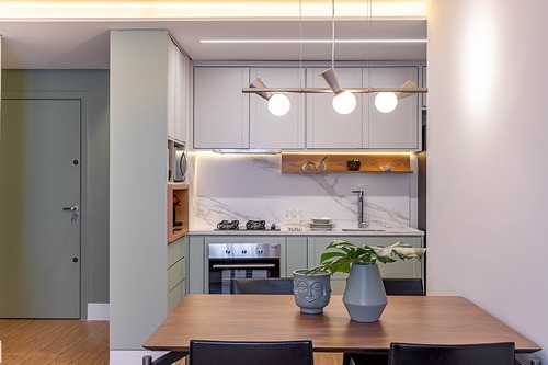 Nesta cozinha, a arquiteta Carina Dal Fabbro adotou as cores verde menta e cinza fendi com a proposta de elevar o frescor ao ambiente | Foto: Rafael Renzo