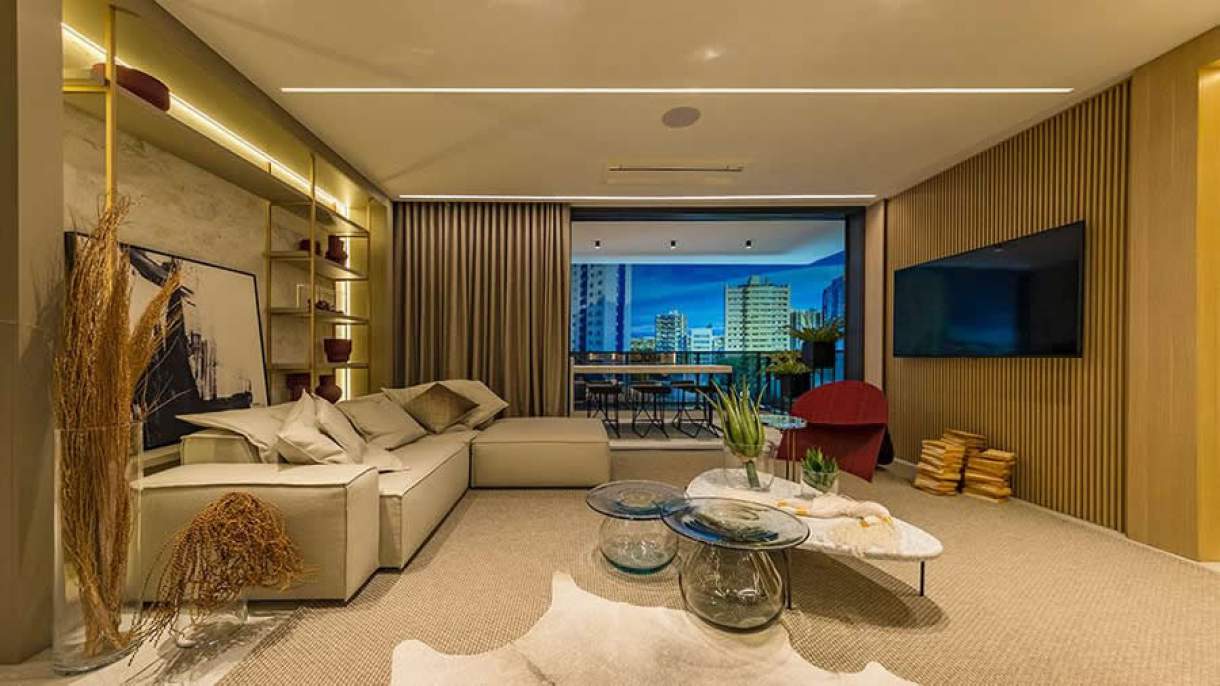 É possível se inspirar com outros ambientes, como o decorado do Aura, em Campinas (SP). Na varanda gourmet, o capim dos pampas impõe volume e altura, em harmonia com a biofilia presente em toda a fachada do edifício. Em uma outra proposta, o elemento natural ganha presença e compõe os demais itens de cor neutra da sala do Atmosphere, lançamento em Maringá (PR).