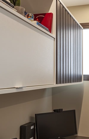 Projetado para um casal que atua na área jurídica, a arquiteta Cristiane Schiavoni se pautou no equilíbrio: divisão igualitária na bancada, além de gavetas e prateleiras na mesma proporção. Situado no corredor de acesso ao dormitório, ela também incluiu um frigobar e uma poltrona, próxima à janela, para os momentos de leitura e concentração | Foto: Carlos Piratininga