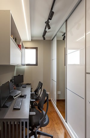 O isolamento ou a conexão com outros cômodos dependerá da personalidade dos moradores e do seu trabalho. “A disposição do home office não pode ficar localizada no dormitório se o horário de expediente interferir no sono do outro”, exemplifica a arquiteta. Por não haver regras específicas, o caminho é sempre agir como um profissional mediador, que compreende cada etapa dessa convivência e resolve, com antecedência, questões que podem ou não acontecer enquanto trabalham.