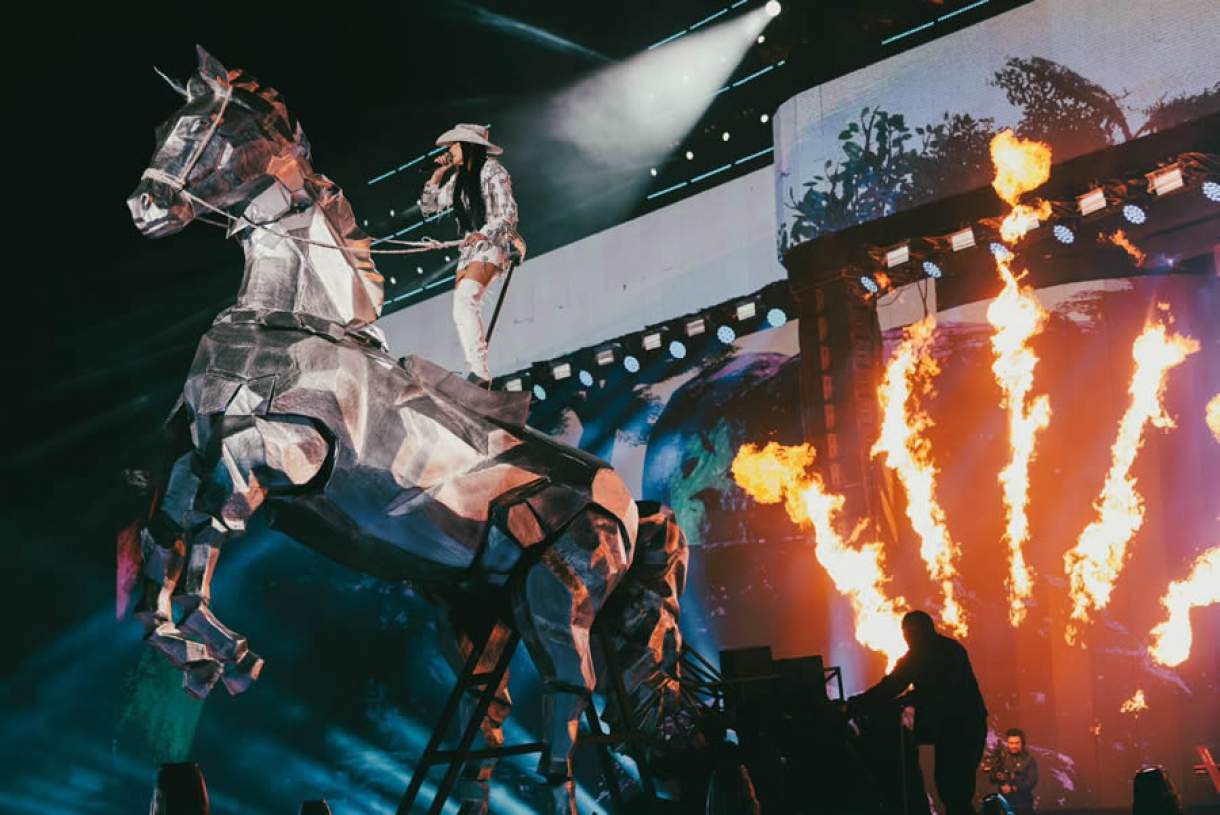 Finalizando em grande estilo, vestida toda de branco, Ana Castela deu o nome e em cima da uma escultura de um cavalo feito de tubo de aço de carbono com acabamento em isopor e fibra de vidro medindo 5 metros, idealizado pela Mode Criative, ela causou impacto ao som de "Tô Voltando".