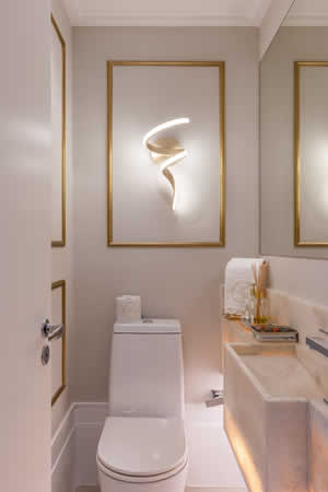 Com essa atmosfera de requinte, o dourado que adorna a boiserie deixou o lavabo ainda mais classudo! No quesito iluminação, além dessa arandela com LED, a bancada com cuba esculpida em ônix foi ressaltada pela fita instalada internamente.