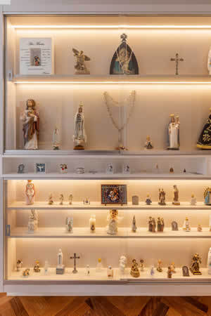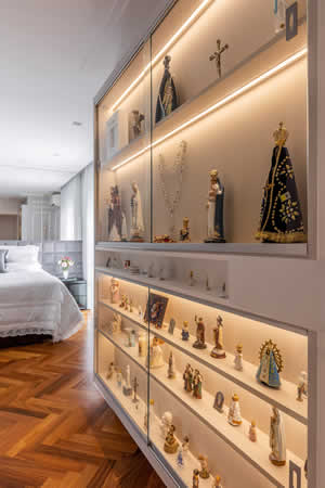 Na concepção de Cristiane Schiavoni, a arquitetura de interiores ‘rompe’ os padrões que compõem um estilo justamente para externar aquilo que realmente é valioso para os moradores. Baseada nesse ideal, logo na entrada do dormitório do casal ela produziu uma marcenaria delicada e charmosa para o oratório. Com o envidraçamento do móvel e a luz de LED na parte interna, o projeto valorizou o espaço onde a moradora pode, diariamente, praticar a sua devoção e fé.