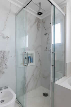 Na suíte do casal, a arquiteta Cristiane Schiavoni incrementou melhorias, como a execução do armário espelhado, os nichos decorativos e a substituição do revestimento da área do box. Com a banheira, ambos vivenciam uma experiência cotidiana de bem-estar.
