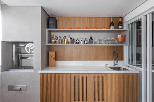 A parte da churrasqueira é um capítulo à parte com total razão: junto com a eficiente marcenaria de efeito ripado, que camufla a adega e a cervejeira, como também propicia espaço para organizar todos os itens fundamentais para a área gourmet, as carnes são grelhadas em um modelo parrilha, que intensifica e preserva o sabor.