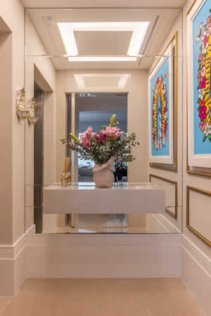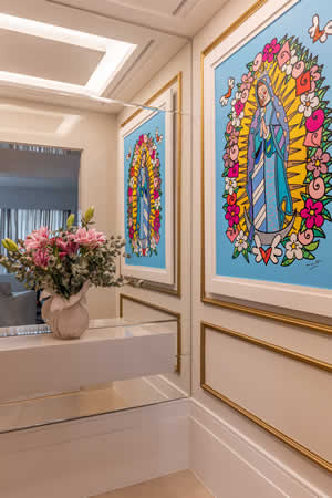 Para Cristiane Schiavoni, o hall de entrada recepciona os visitantes e dá a tônica do jeito acolhedor de todo apartamento. Ao sair do elevador, a obra de Nossa Senhora de Guadalupe, assinada por Romero Britto, ressalta a religiosidade e a devoção de nossa moradora e enfatiza as boas-vindas.