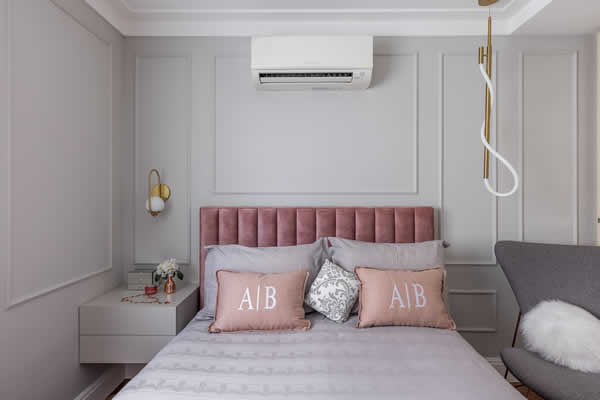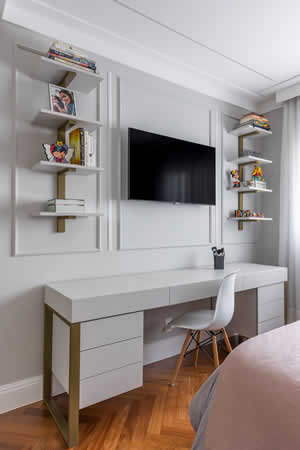 No quarto da Amanda, uma das filhas do casal, o viés romântico direcionou o décor. Essa nuance de um cinza bem clarinho das paredes emolduradas com boiseries evoca uma agradável combinação com a cabeceira estofada rosa e o dourado dos acessórios de iluminação. A arquiteta não deixou de incluir um elemento que havia ficado no passado, mas que passou a fazer total diferença no dia a dia das mulheres: a penteadeira. “No desenho da marcenaria, volto nossa atenção tanto para a estética, mas também para quatro atributos que não podem faltar: iluminação voltada para o rosto, espelho em uma altura que a pessoa consiga se visualizar, possibilidades de organização com gavetas com ou sem divisórias e uma ergonomia que preze por momentos de pleno autocuidado”, discorre Cristiane sobre os atributos desse cantinho feminino.