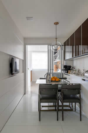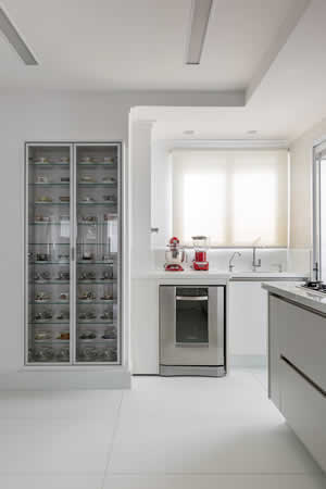 Na cozinha, a arquiteta Cristiane Schiavoni valorizou a distribuição e a marcenaria, além de incluir uma cristaleira expõe a coleção de xícaras da moradora | Foto: Rafael Renzo
