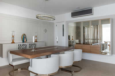 A sala de jantar reflete uma sutil combinação entre o moderno e o clássico. Com o design ousado das cadeiras com ares de poltrona curva – com o intuito de abraçar quem ali está em uma ocasião especial proporcionada pelos moradores –, e a elegância das boiseries que adornam a parede principal, o buffet suspenso acompanha o mesmo tom off white. Próximo à mesa, o bar, com ares de cristaleira, foi idealizado para acomodar os rótulos do morador, um grande apreciador e que gosta de servir. “Nosso escritório foi bastante detalhista nessa produção, uma vez que consideramos os tipos de bebidas, bem como as alturas certas para comportar as taças”, especifica a profissional. Para acrescentar, o vidro reflecta se torna um espelho quando as luzes de LED da parte interna são acionadas.