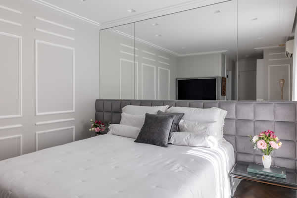 No espaço da cama, uma mescla de sofisticação e super-romântico, a paleta de off white e nuances de cinza acompanharam as definições presentes na cabeceira estofada e o enxoval. “Note que a boiserie continua presente, porém com mais destaque”, elenca Cristiane. “E as mesas de cabeceiras são peças antigas dos moradores que foram incorporadas pelo significado que adicionam à vida dois”, completa.